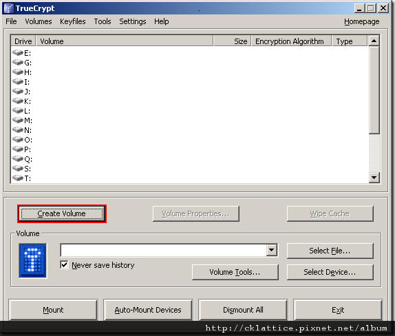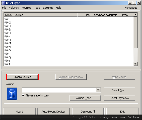 The main TrueCrypt window should appear. Click Create Volume (marked with a red rectangle for clarity).