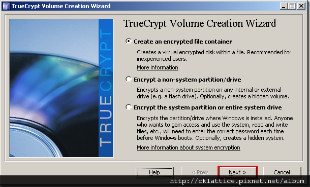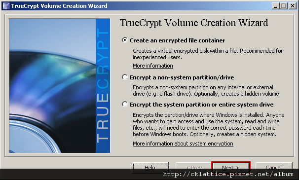 In this step you need to choose where you wish the TrueCrypt volume to be created. A TrueCrypt volume can reside in a file, which is also called container, in a partition or drive. In this tutorial, we will choose the first option and create a TrueCrypt volume within a file.