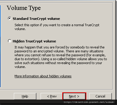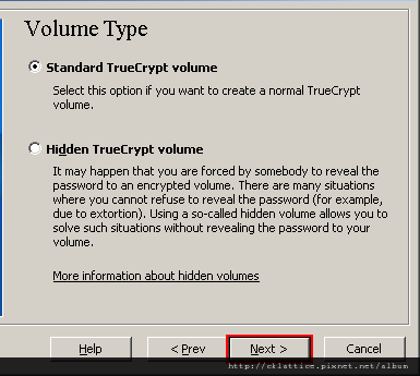 In this step you need to choose whether to create a standard or hidden TrueCrypt volume. In this tutorial, we will choose the former option and create a standard TrueCrypt volume.