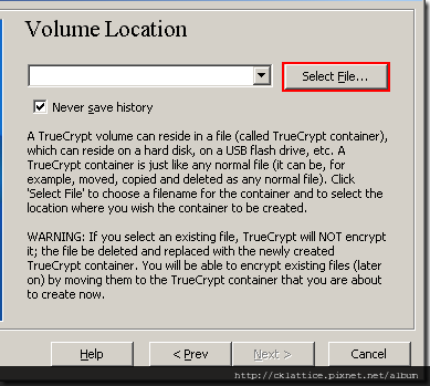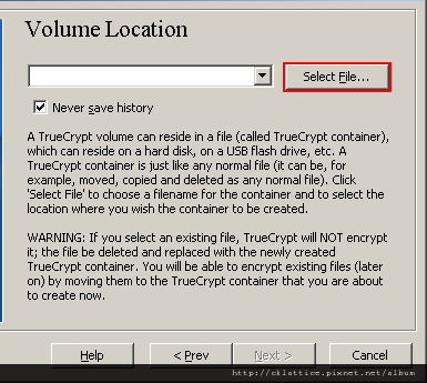 IMPORTANT: Note that TrueCrypt will not encrypt any existing files (when creating a TrueCrypt file container). If you select an existing file in this step, it will be overwritten and replaced by the newly created volume (so the overwritten file will be lost, not encrypted). You will be able to encrypt existing files (later on) by moving them to the TrueCrypt volume that we are creating now.*