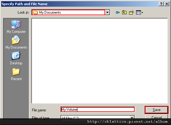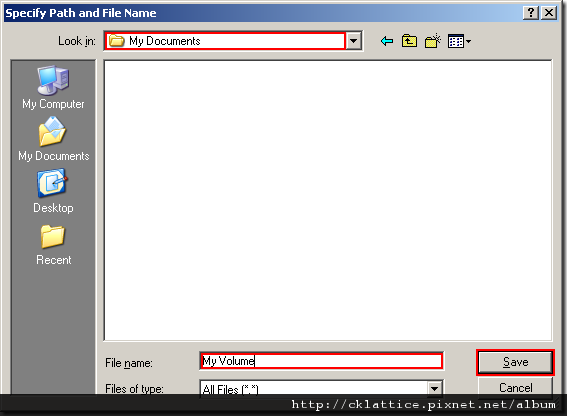 In this tutorial, we will create our TrueCrypt volume in the folder D:\My Documents\ and the filename of the volume (container) will be My Volume (as can be seen in the screenshot above). You may, of course, choose any other filename and location you like (for example, on a USB memory stick). Note that the file My Volume does not exist yet – TrueCrypt will create it.