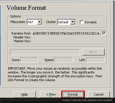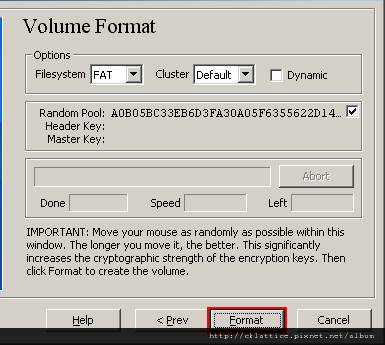 Move your mouse as randomly as possible within the Volume Creation Wizard window at least for 30 seconds. The longer you move the mouse, the better. This significantly increases the cryptographic strength of the encryption keys (which increases security).