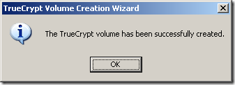 Volume creation should begin. TrueCrypt will now create a file called My Volume in the folder D:\My Documents\ (as we specified in Step 6). This file will be a TrueCrypt container (it will contain the encrypted TrueCrypt volume). Depending on the size of the volume, the volume creation may take a long time. After it finishes, the following dialog box will appear: