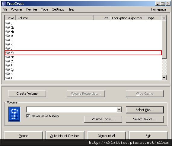 In the remaining steps, we will mount the volume we just created. We will return to the main TrueCrypt window (which should still be open, but if it is not, repeat Step 1 to launch TrueCrypt and then continue from Step 13.)